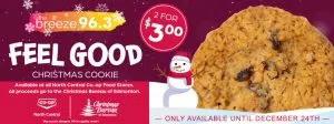 From December 1st - 24th, pick up your 96.3 The Breeze Feel Good Christmas Cookie! These Chocolate Chip and Monster cookies are extra special because all proceeds go to the Christmas Bureau of Edmonton, which provides holiday meals and gifts to Edmontonians in need through their Food Hamper Program and Adopt-A-Teen Pro...